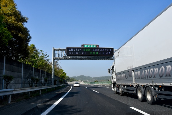 広域情報表示。広島サミットの開催に伴う山陽道の規制が予告されていた。