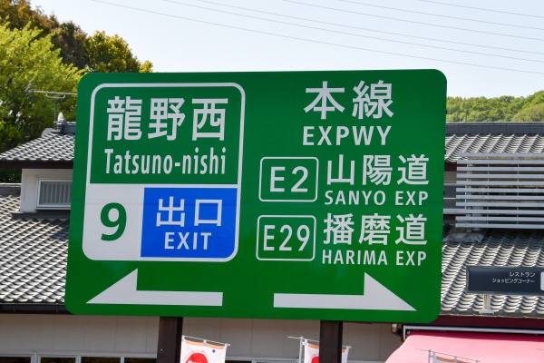 龍野西SAは、商業施設のど真ん前に案内標識が置かれている。愛好家も唸る絶好の配置を活かし、駐車場から堂々と中望遠で標識をズーム撮影する。