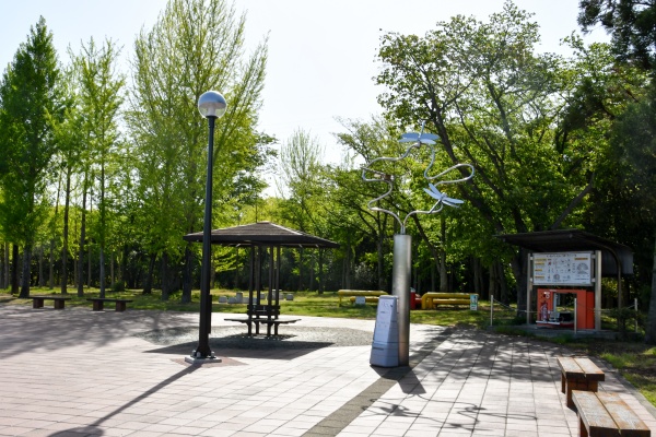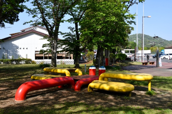 反対側の園地に置かれているベンチも赤とんぼがモチーフである。どこが椅子でどこがテーブルか少しわかりにくいが、面白い構造物だと思う。