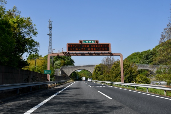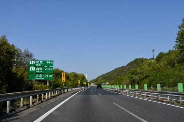 岡山県内に入り、距離標識に広島の地名が入るようになった。