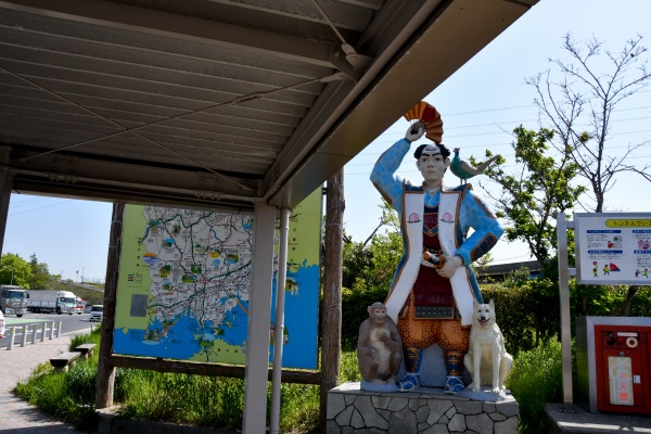駐車マスの近くには桃太郎像が置かれている。犬・サル・キジのお供とともに立つその姿は、JR岡山駅前のものが有名だがこちらも迫力では負けていない。