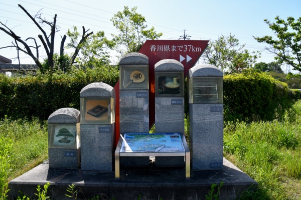 吉備SAは倉敷JCT手前の最終休憩施設とあり、ちょっとだけ四国を紹介するモニュメントも置かれている。右から2番目のうどんが目を引く特産物案内も見もの。香川県まで37km、意外と近いんですね。