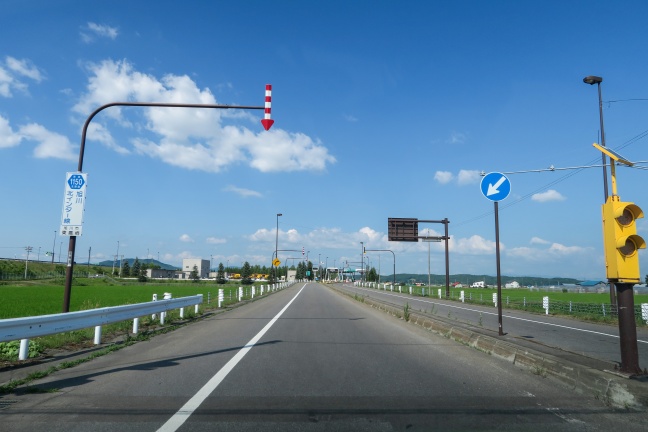 旭川市と鷹栖町の境界に程近い東鷹栖地区の市街地を抜けたところで、旭川北インターへの案内標識がある。
