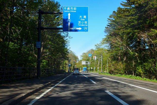 支笏湖を後に、千歳市街へ向かうr16と苫小牧方面へ向かうR453→R276分岐が近づく。