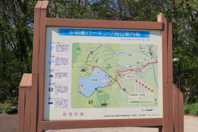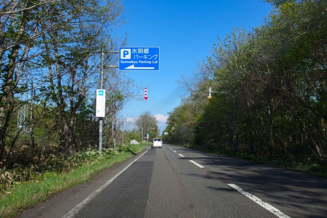 千歳第三ダム脇のカーブを過ぎると、水明郷パーキングという駐車場への案内標識が置かれている。