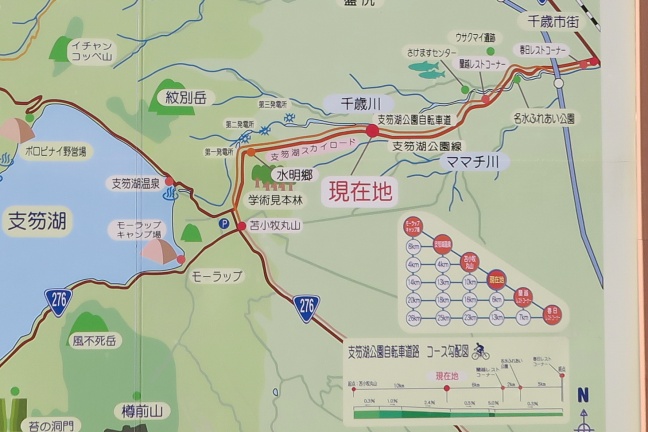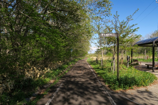 案内板の裏には、このようにサイクリングロードが整備されている。ここは千歳市街と支笏湖の中間地点に近く、休憩所としてはありがたいポイントだろう。