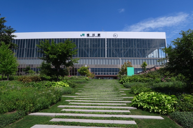 JR旭川駅の南口側庭園から、駅舎を見上げる。