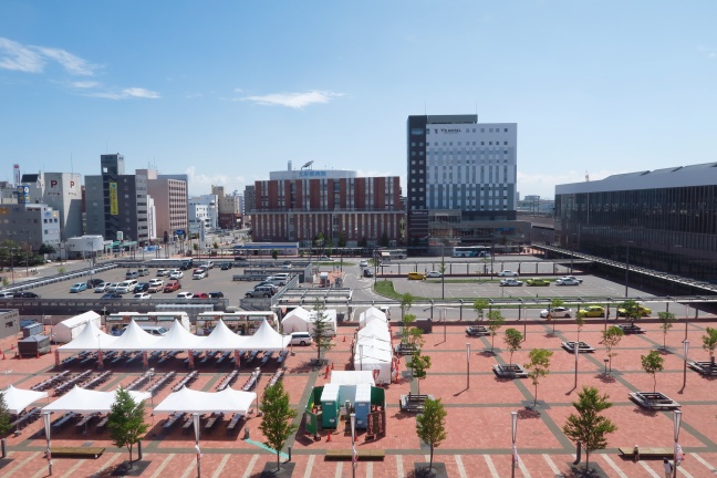 手前の広場はイベントスペースとして利用されており、撮影当時は旭川夏まつりのイベントの1つ「夏のフードフェスティバル」が行われていた。奥は左側に駅前広場駐車場(階下に駐輪場がある)、右側にタクシー・一般車乗り場で、更に奥はバスタッチとなる。旧駅時代はちょうど写真中央の位置までが駅前広場(当時はほぼ駐車場)で、右側は駅舎を含む鉄道用地であった。なお、旭川駅前広場は旭川市が管理しており、道道は右奥の宮下通9交差点が起点となる。