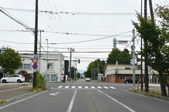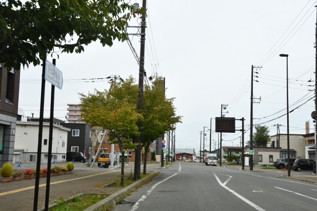 終点交差点付近からJR永山駅方面を振り返る。きれいな道だし街路灯にステッカーがあるけど、標識は1つも立っていない。道道だと意識して通る人はあまりいないかもしれない。
