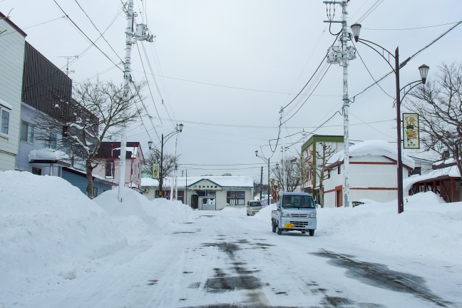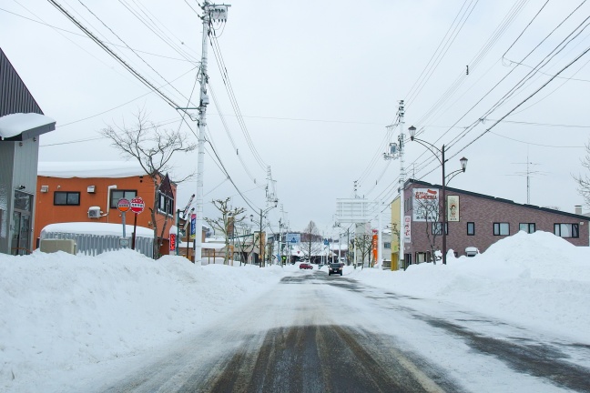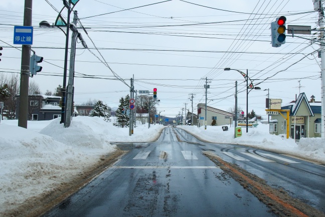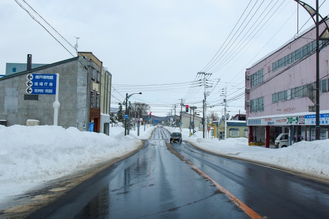 撮影は2017年の年末。直前に降った雪で道路際には雪山ができているが、気温が高く国道の路面は融雪していた。