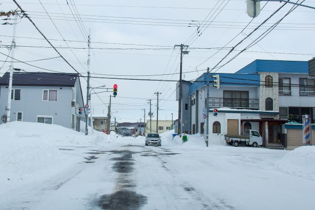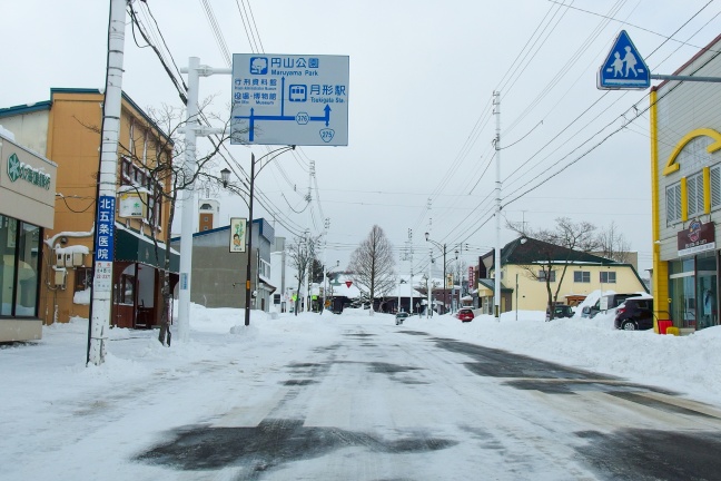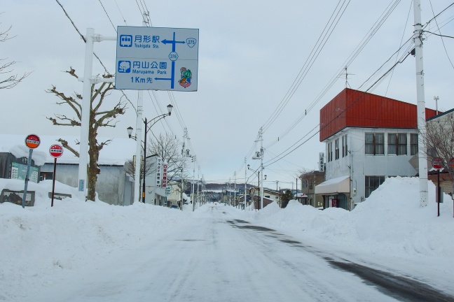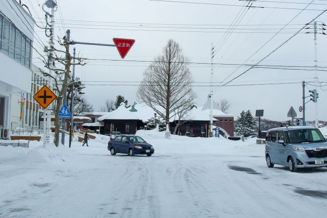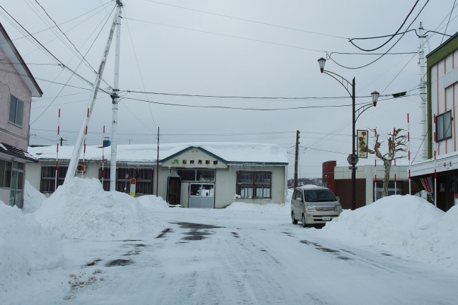 JR石狩月形駅前がr376起点となる。積雪していて道道とJR敷地の境界は見分けられなかったが、実際は駅前の歩道が途切れるあたりで舗装が切り替わっていたようだ。