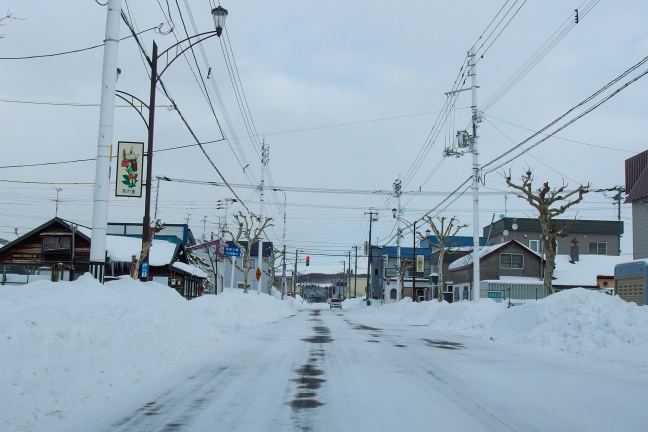 交差点を左折し、道道のトレースを始める。本来は幅員広めの2車線路なのだが、雪山でだいぶ狭くなっている。