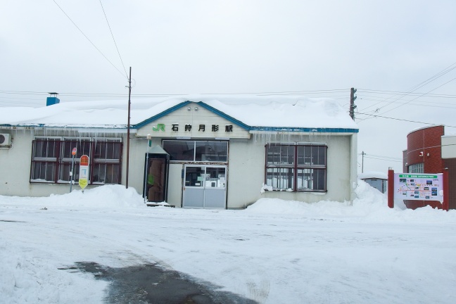 交差点を左折すると、正面にはJR石狩月形駅の駅舎が見渡せる。