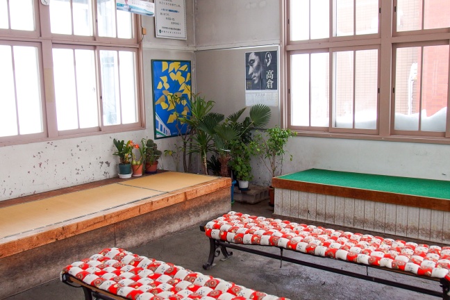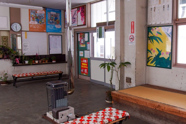 駅待合室は平らなベンチと、畳の敷かれた待合スペースがある。1950年代築の駅舎にして紅白模様の座布団と奥の観葉植物、そして高倉健のポスターが昭和の情景を醸し出していた。