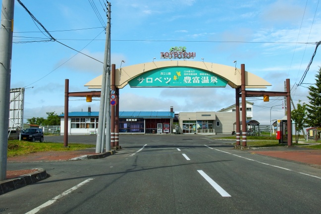 信号交差点を過ぎると、「サロベツ豊富温泉」と書かれた大きなアーチに出迎えられ、JR豊富駅前の駅前広場に入ることができる。