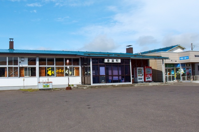 JR豊富駅の駅舎。現駅舎が落成したのは1966年で、20年後の1986年に無人化された(管理はJR幌延駅)。右隣には豊富観光情報センターが置かれており、JRの記念乗車券(・町民乗車票)に加え、観光案内所として町内の特産品の販売やレンタサイクルの取扱を行っている。