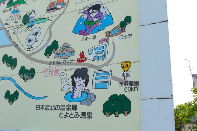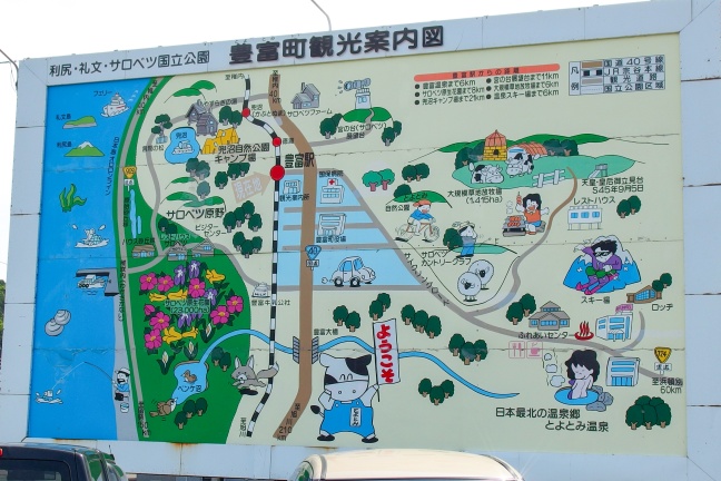 駅前には豊富町観光案内図が置かれていた(現在は撤去)。見ての通り豊富町にある観光名所を図にしてデフォルメした地図に配置した80~90年代っぽい案内図で、中央下にいる牛は豊富町のカントリーサインでしゃぶしゃぶ温泉に使っている牛くんのようである。