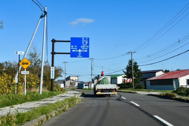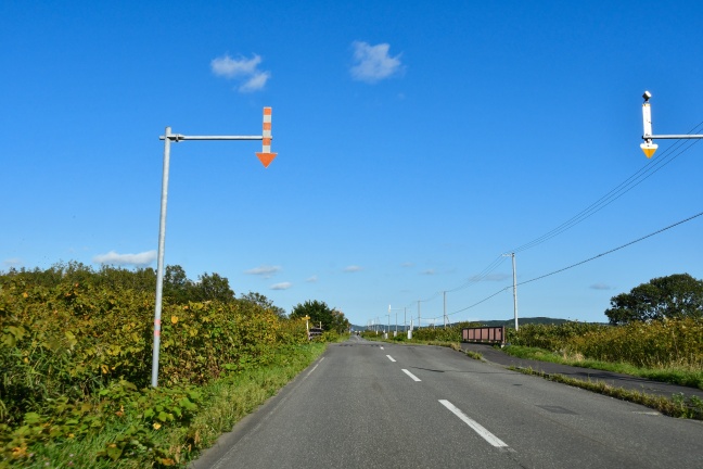 交差点に置かれていた道道標識は比較的新しいもので、西日を受け青色がきれいに映えていた。