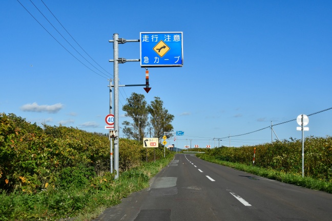 ここでカーブを予告する物々しい標識。湿原からごく緩いカーブしかなかったので注意を促すのもわかる。