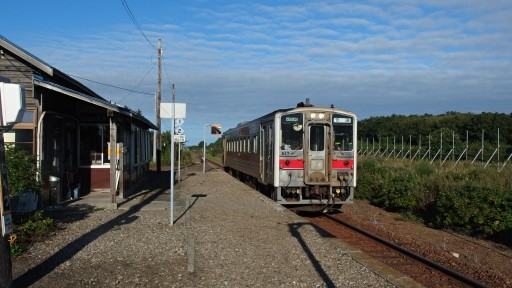 駅舎を一旦スルーし、午前7時12分着の釧路行き普通列車を出迎える。 ちなみに釧路方面行きの朝一番の列車だったりする。裏話だが、この列車、実は原生花園駅の辺りで遭遇した列車である。ディーゼル列車の加速が悪いのをいいことに国道と農道を突っ走り列車を車で追越し、こんな風に2回目のお出迎えをしたというわけである。 |