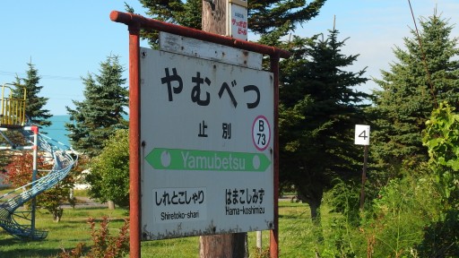 止別駅の駅名票。 隣駅の知床斜里に張替え痕があるのは、1998年に斜里から知床斜里に駅名が変更されたことに由来する。駅番号はB73。駅番号は釧路(K53)基準で振られているが、番号が大きい・・・ |