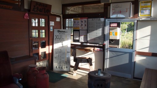 駅待合室の様子。朝早すぎて「えきばしゃ」は営業前。画面正面にメニューがあるが、まぁまぁ一般的な価格で色んなメニューが食べられるので今度は是非立ち寄ってみたいものである。 ちなみに、画像左端の板張りの壁の部分にはかつて出札窓口があった。かつて「えきばしゃ」による委託販売が行われていたらしい。 |