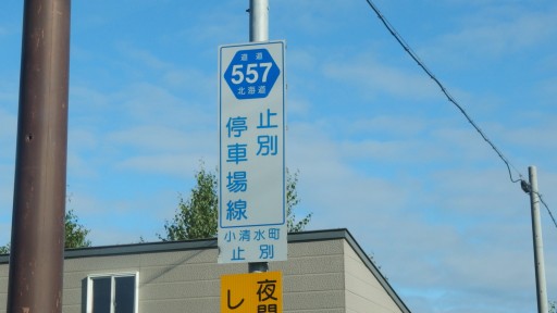 Uターンした理由はこの道道標識をアップで撮影するためだったり。 r557の道道標識はこれ1枚で、六角形の標識が単独で設置されているわけでもない。まぁ、無いより楽しいからいっか・・・ |
