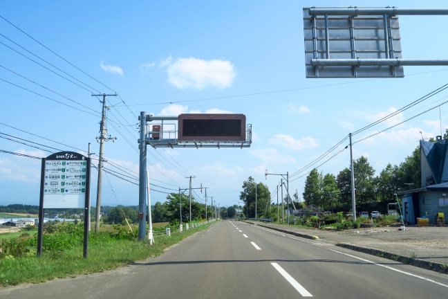 交差点を右折してまもなく、道路情報表示と観光地への案内看板が登場する。