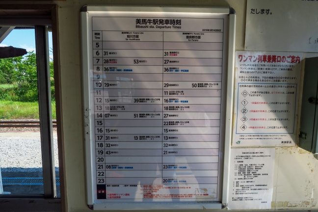 駅内には時刻表が貼られている。JR富良野線の駅である美馬牛には、1時間1本ぐらいのペースで列車が停車する。
