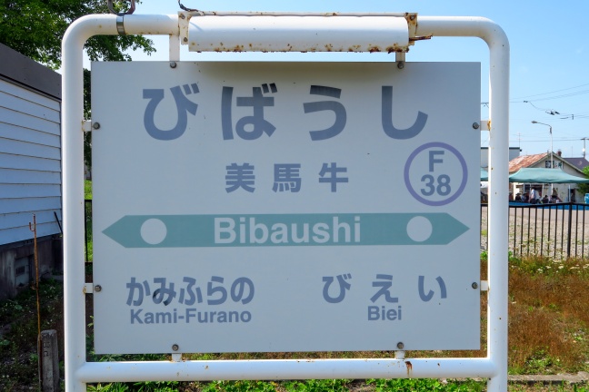 美馬牛駅の駅名標。駅番号はF38。隣駅は美瑛と上富良野で、どちらも少し駅間が長くなっている。