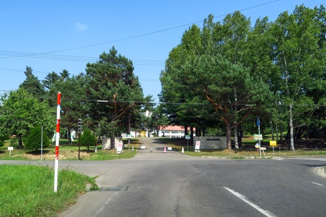 ここで道道は90度右へ折れ曲がる。正面に美馬牛小学校の入口を望む。