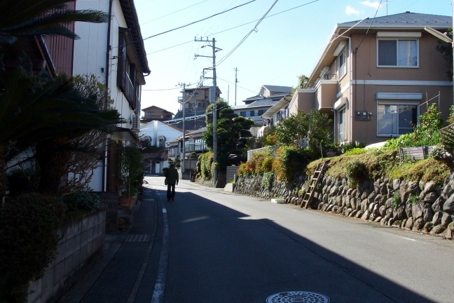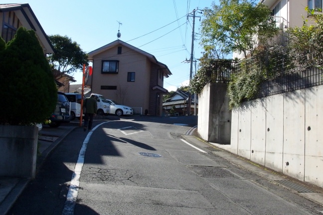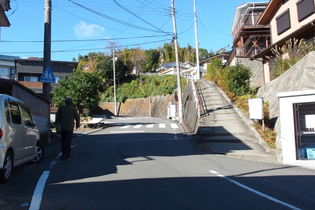 ここでぐるっと回りながら急勾配。見た感じ10%はありそう。だが、カーブでうねっているので内側に入るともっときつい。道路奥に見える掠れた「横断歩道予告」がなお一層生活感を引き立てる。