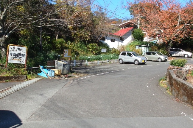 道路沿いに駐車場が整備されている。伊豆多賀駅はまだ見えないが、このカーブを曲がった先にある。