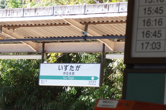 最後に、伊豆多賀の駅名票。足腰を少し休ませつつ、上り列車を待つ待合室から望遠で撮影する。2015年当時はひらがなが主役の駅名票が置かれていたが、2025年になって調べてみるとどうやら駅ナンバリングの入ったものに置き換えられたように思われる。